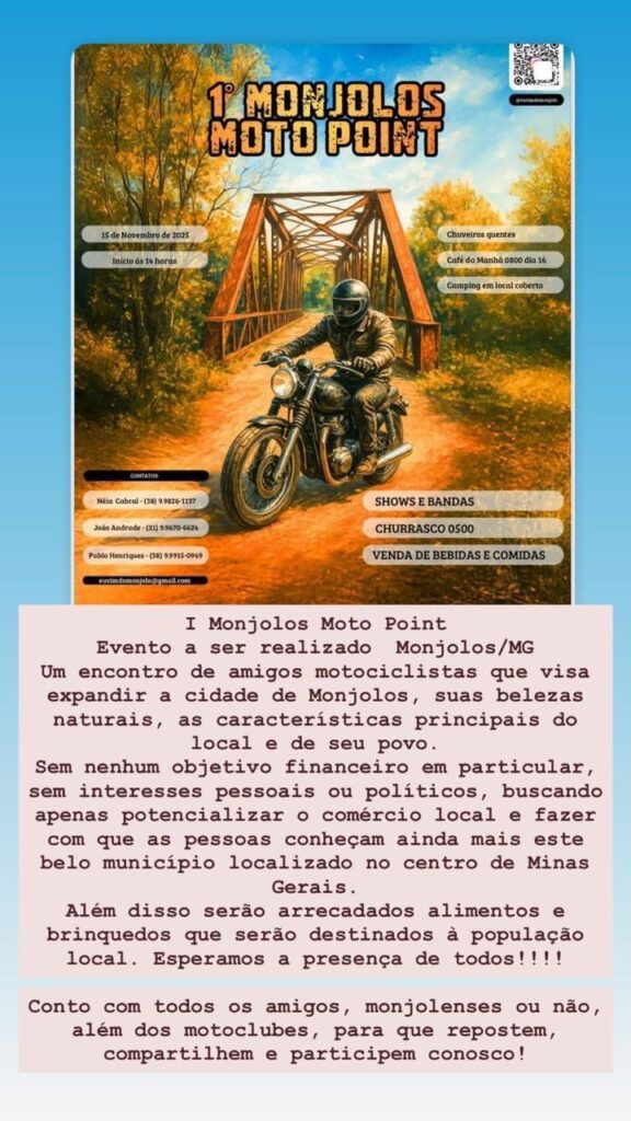 👉 “Contamos com todos os amigos, monjolenses ou não, e com todos os motoclubes. Repostem, compartilhem e venham fazer parte dessa história!”