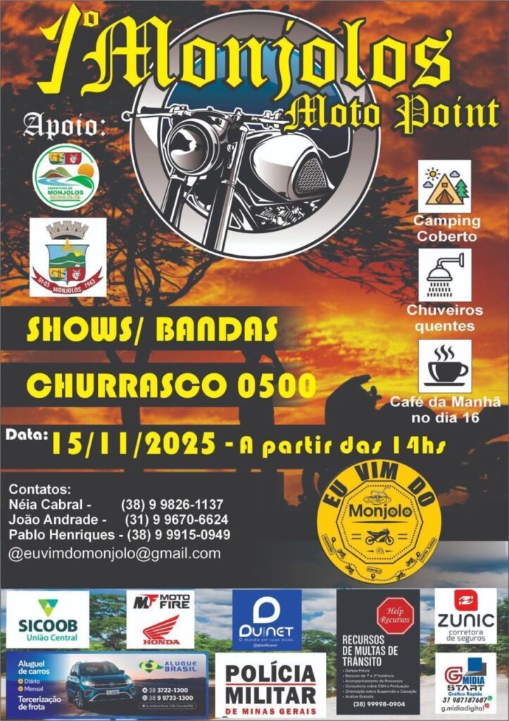 No dia 15 de novembro de 2025, a cidade de Monjolos (MG) será palco do 1º Monjolos Moto Point, um encontro de motociclistas e apaixonados pela estrada que promete reunir amigos, turistas e visitantes em uma grande celebração de cultura, turismo e integração. O evento terá início às 14h, com programação que segue até o dia seguinte.